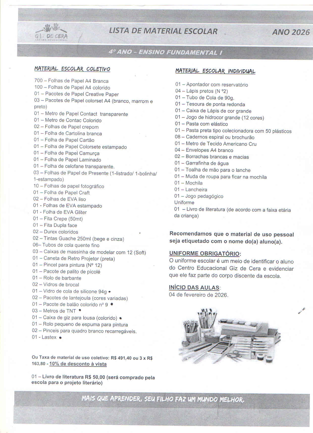 Lista de Material Escolar Coletivo 4° Ano - Giz de Cera
