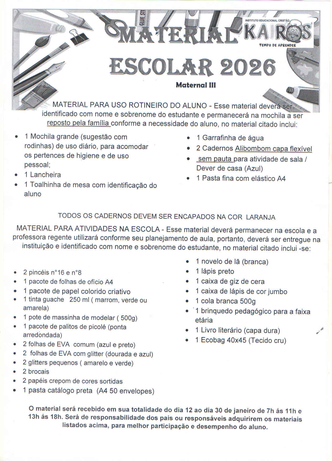 Lista de Material escolar 2° período - Kairós