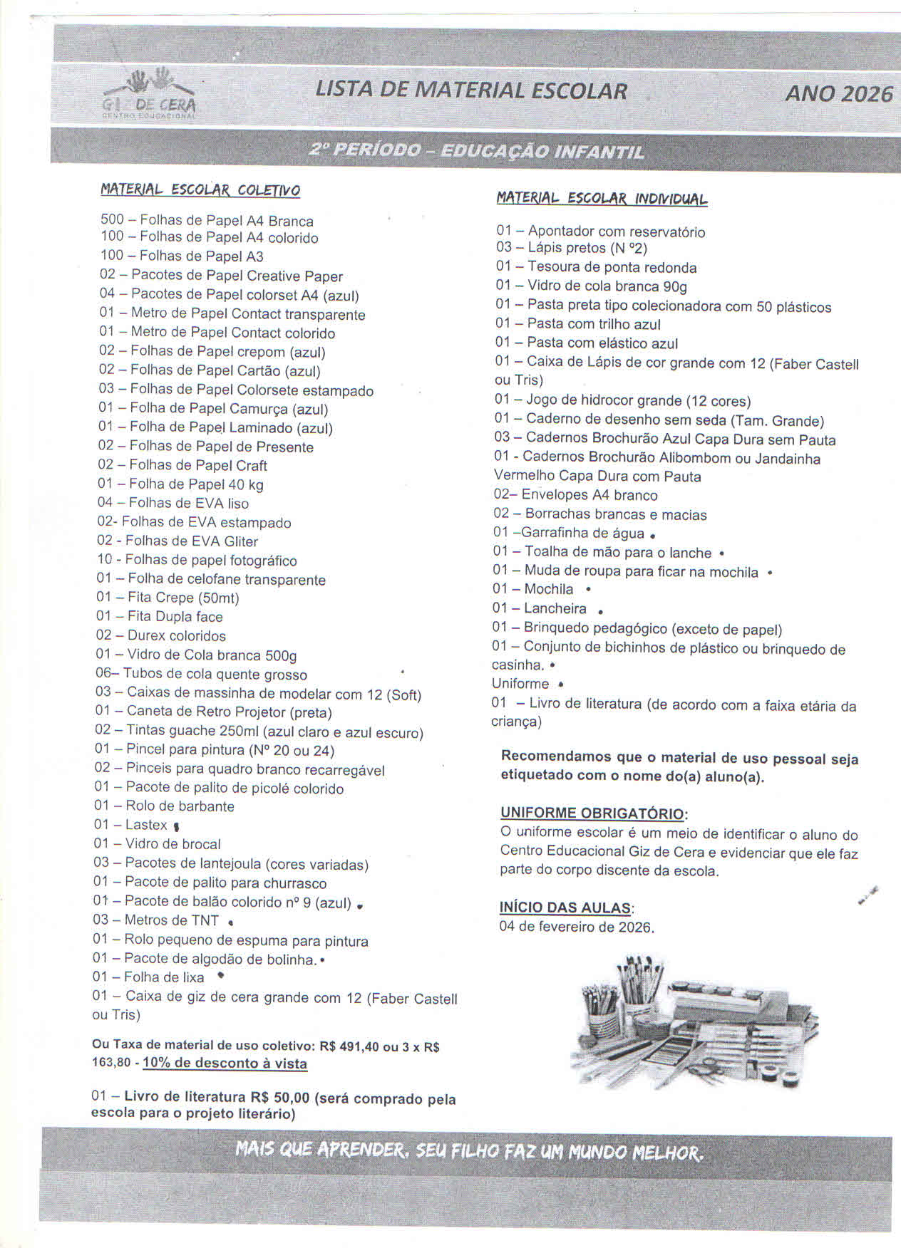 Lista de Material Escolar Individual 2° ano - Giz de Cera