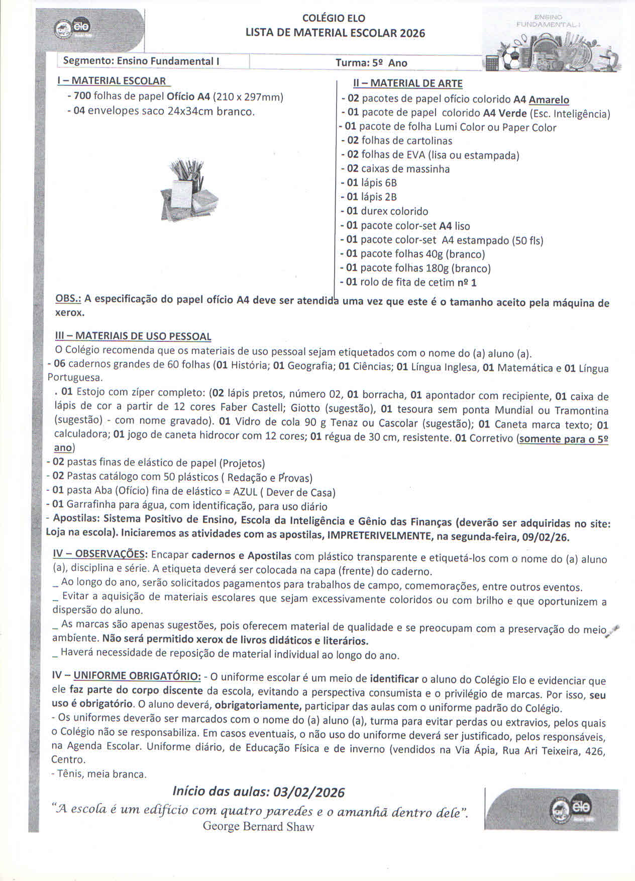 Lista de Material Escolar 5° Ano - Colégio Elo