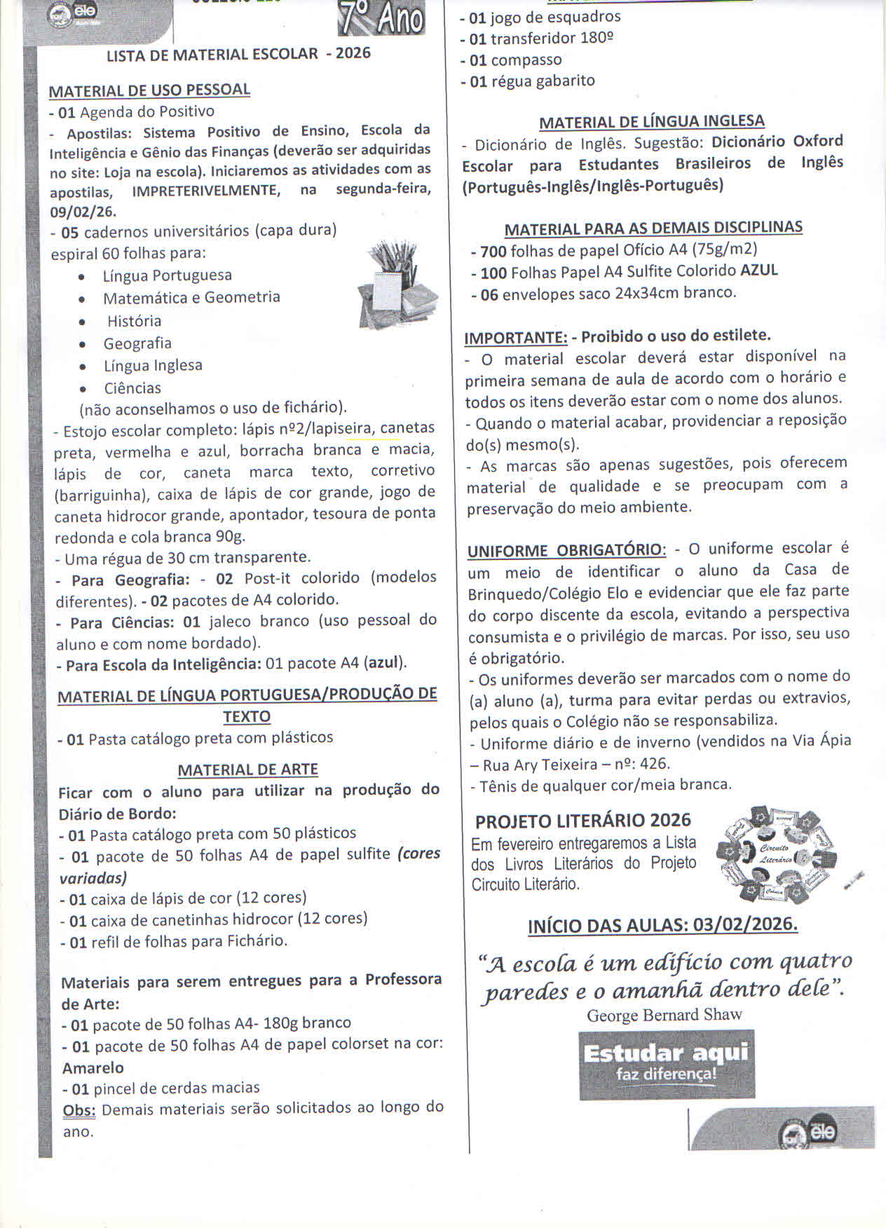 Lista de Material Escolar 7° Ano - Colégio Elo